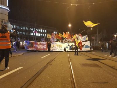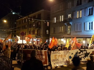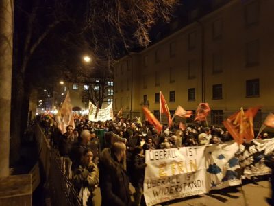Bildirilerin de dağıtıldığı eylemde kanton milletvekillerinin toplantı salonuna geçişi esnasında işgal saldırısı protesto edildi. Kitle daha sonra kent merkezine doğru yürüyüşe geçti.
