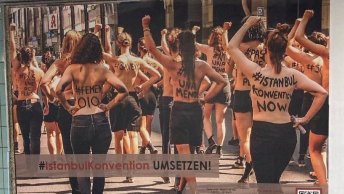 FEMEN aktivistleri, bu yılın başından bu yana en az 65 kadının katledildiği Almanya’da 40 farklı noktaya İstanbul Sözleşmesi’nin uygulanması için dev afişler astı.
