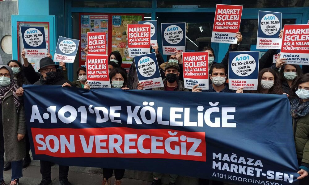 Mağaza Market-Sen, “A101 her türlü işgüzarlığı yaparak işçilerin haklarını ellerinden almaya çalışıyor. İşçileri kölece çalıştırmaya, ağalıkla yönetmeye, dilediği zaman kodlara başvurarak işten çıkarmaya çalışıyor” diye belirtildi.