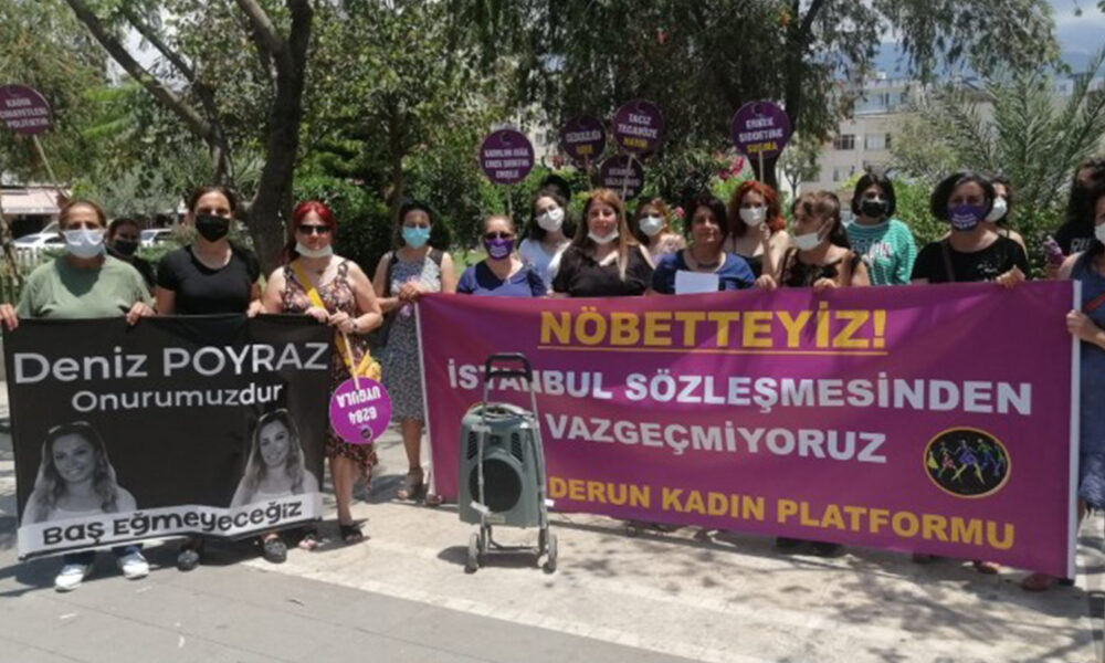 İskenderun Kadın Platformu, İstanbul Sözleşmesi’ne sahip çıkmak için Eski Bit Pazarı’nda bir araya geldi. “Nöbetteyiz! İstanbul Sözleşmesi’nden vazgeçmiyoruz” ve “Deniz Poyraz onurumuzdur. Baş eğmeyeceğiz” pankartını taşıyan kadınlar, Deniz Poyraz’ın katledilmesini de kınadı. İskenderun Kadın Platformu üyesi Feyruz Gör, İstanbul’da düzenlenen “Büyük Kadın Mitingini” selamladı.