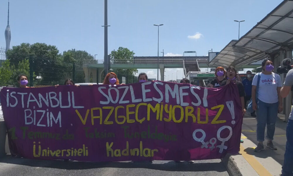 Üniversiteli Kadınlar, “İstanbul Sözleşmesi bizim, vazgeçmiyoruz” yazılı pankartlarla, Altunizade metrobüs istasyonunu çift yönlü kapattı.
