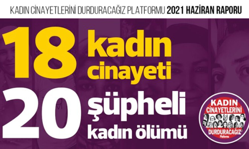 Kadın Cinayetlerini Durduracağız Platformu, Haziran ayına ilişkin raporunu açıkladı. Rapora göre, 2021 Haziran ayında erkekler tarafından 18 kadın öldürüldü, 20 kadın şüpheli şekilde ölü bulundu.