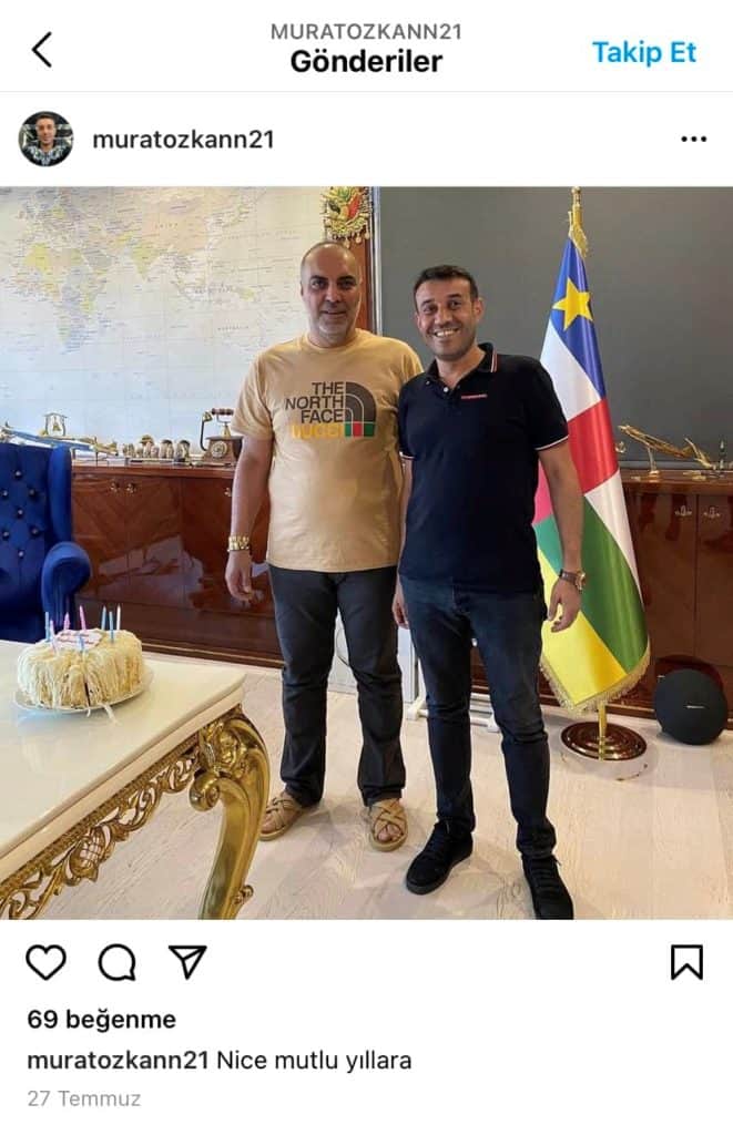 Bu arada düne (4 Ağustos) kadar herkese açık profil bugün itibarıyla gizlendi. Özkan’ın fotoğrafları arasında makamında dikkat çeken bir ayrıntı daha var: Orta Afrika Cumhuriyeti bayrağı. Emniyet kaynaklarının iddiasına göre Murat Özkan, bu ülkenin fahri konsolosu.