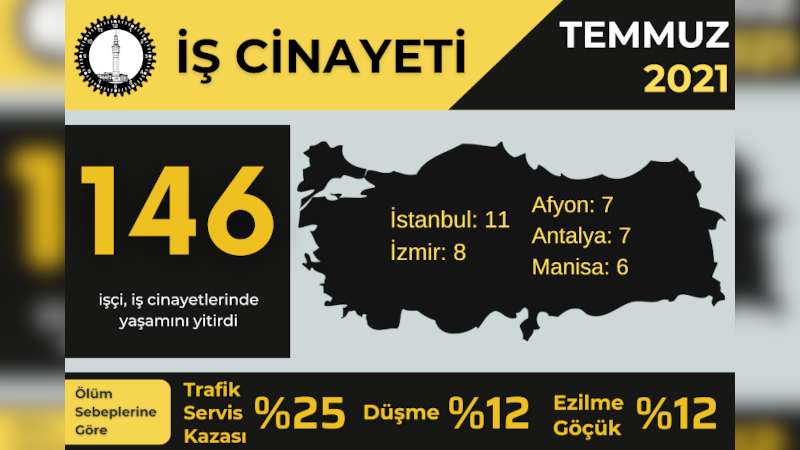 İSİG raporuna göre Temmuz ayında en az 146 işçi, 2021 yılının ilk yedi ayında ise en az 1301 işçi yaşamını yitirdi. İş cinayetlerinin aylara göre dağılımına bakıldığında; Ocak ayında en az 203 işçi, Şubat ayında en az 142 işçi, Mart ayında en az 144 işçi, Nisan ayında en az 257 işçi, Mayıs ayında en az 236 işçi, Haziran ayında en az 173 işçi, Temmuz ayında en az 146 işçi hayatını kaybetti.
