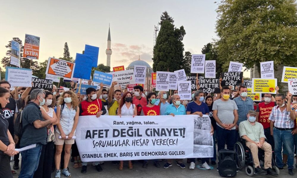 İstanbul Emek, Barış ve Demokrasi Güçleri’nin çağrısıyla 17 Ağustos 1999 tarihinde gerçekleşen depremin yıldönümünde Beşiktaş’ta Barbaros Meydanı’nda eylem yapılıyor. Eylemde “Rant, yağma, talan… Afet değil cinayet! Sorumlular hesap verecek!” yazılı pankart açıldı.