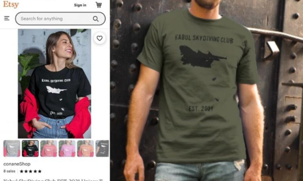 ABD merkezli alışveriş platformu Etsy, Taliban’ın Afganistan’ı işgal etmesinin ardından ülkeden kaçmaya çalışan Afganların C-17 askeri nakliye uçağından aşağı düşme anının yer aldığı tişörtleri ‘Kabil Atlama Kulübü’ ifadeleriyle satışa sundu. Tişört tepkilerin ardından söz konusu siteden kaldırıldı.