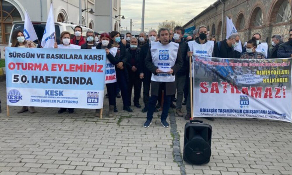 Birleşik Taşımacılık Çalışanları Sendikası (BTS), üyelerinin sürgün edilerek, baskıya maruz kalmasına karşı başlattığı nöbeti eylemi 50’nci haftasında sürdü. Bu haftaki eyleme Hakların Demokratik Partisi (HDP) İzmir Milletvekili Murat Çepni ve İzmir İl yöneticileri de katılım sağladı. Alsancak Garı önünde yapılan nöbette, “Demiryolları halkındır satılamaz” pankartı açılırken kitle sık sık, “Gün gelecek devran dönecek AKP halka hesap verecek” sloganı attı.