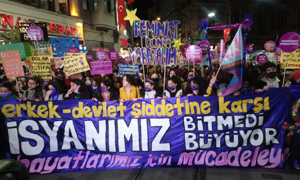 İstanbul’da 8 Mart 2020’de yapılan ‘Feminist Gece Yürüyüşü’nde gözaltına alınarak haklarında ‘kanuna aykırı toplantı ve yürüyüşlere silahsız katılarak ihtara rağmen kendiliğinden dağılmama, görevi yaptırmamak için direnme, kamu malına zarar verme’ suçlamasıyla dava açılan 35 kişinin yargılanmasına devam edildi. Hakim, savunma yapan sanığa, “Erkekler de öldürülüyor. ’10 kadın öldürülüyorsa 20 erkek öldürülüyor’ diyenler de var. Biz de mi toplanalım” dedi.