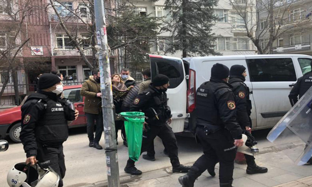 Ankara Kadın Platformu’nun, Tandoğan Meydanında yapılacak olan 8 Mart mitingine çağrı yapmak istedikleri basın açıklamasına polis tarafından müdahale edildi. Çankaya Belediyesi önünde toplanan kadınları dağıtarak açıklama yapılmasını engelleyen polis, belediye önünden sokaklara dağılan kadınları ise Konur Sokak’ta sıkıştırarak darp etti. En az 8 kadın ters kelepçeyle gözaltına alındı.