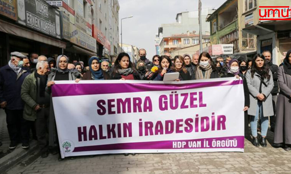 Halkların Demokratik Partisi (HDP) Van İl Örgütü HDP Diyarbakır Milletvekili Semra Güzel’in dokunulmazlığının kaldırılmasını düzenledikleri basın açıklamasıyla protesto etti. HDP Edremit İlçe binası önünde düzenlenen açıklamaya Tevgera Jinên Azad (TJA), Demokratik Bölgeler Partisi (DBP), Kamu Emekçileri Sendikaları Konfederasyonu, (KESK) Van Şubeler Platformu’nun yanı sıra çok sayıda kişi katıldı. “ Semra Güzel halkın iradesidir” pankartının açıldığı eylemde HDP İpekyolu İlçe Eş başkanı Canan Uzunay konuştu.