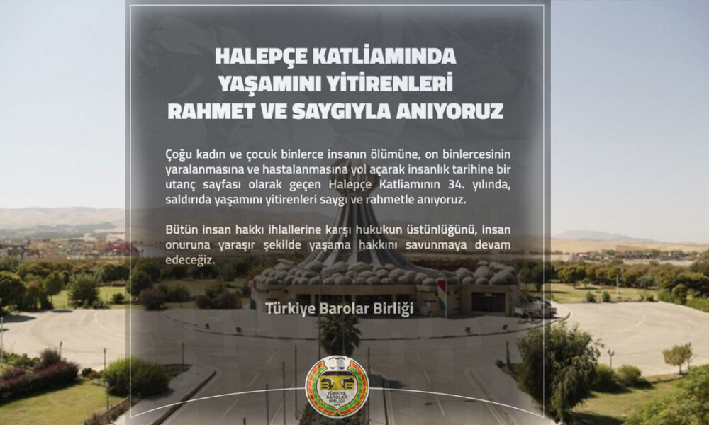 Halepçe Katliamı’nın 34’üncü yıl dönümüne ilişkin açıklama yapan Türkiye Barolar Birliği, “Halepçe katliamında yaşamını yitirenleri rahmet ve saygıyla anıyoruz” dedi.