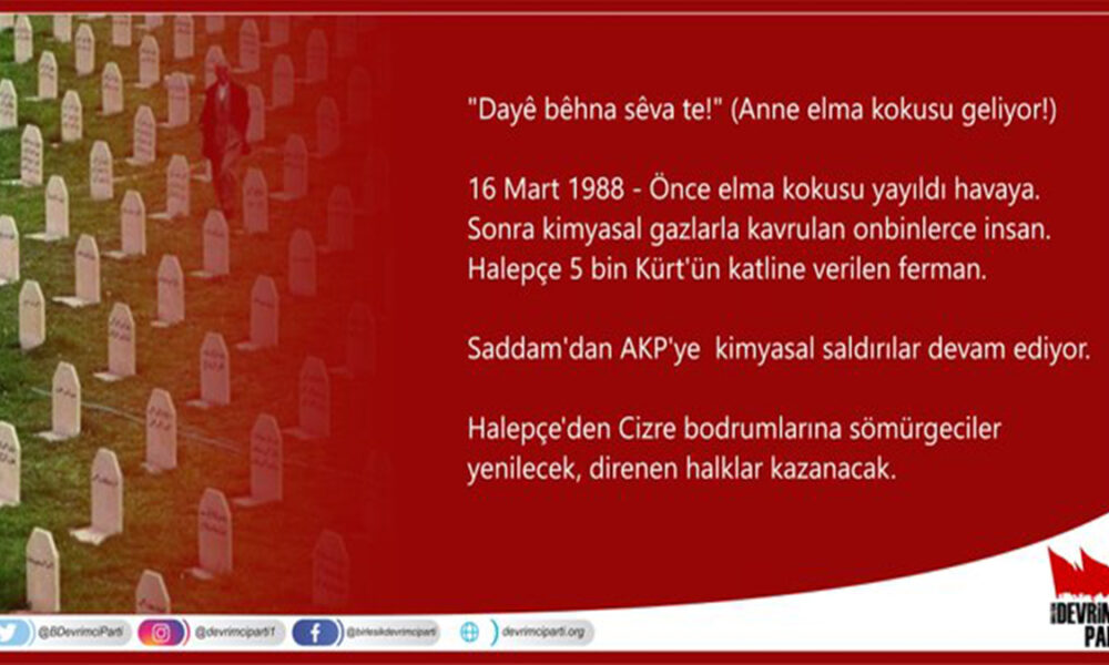 Birleşik Devrimci Parti (Devrimci Parti), Halepçe Katliamının 34. yılında açıklama yayımladı. Açıklamada; “Dayê bêhna sêva te – Anne elma kokusu geliyor. Önce elma kokusu yayıldı havaya. Sonra kimyasal gazlarla kavrulan on binlerce insan. Halepçe 5 bin Kürt’ün katline verilen ferman. Halepçe’den Cizre bodrumlarına sömürgeciler yenilecek, direnen halklar kazanacak.” denildi.