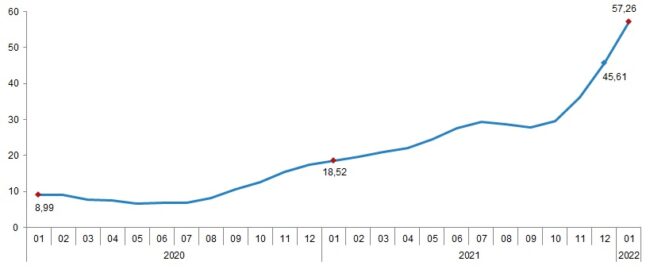 Tarımsal girdi fiyat endeksi, 2022 yılı Ocak ayında bir önceki aya göre %10,12, bir önceki yılın Aralık ayına göre % 57,26 oranında arttı