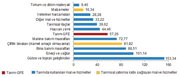 Tarımsal girdi fiyat endeksini etkileyen alt gruplar arasında en fazla etkileyen yıllık bazda yüzde 153,34 artışla gübre ve toprak geliştiriciler oldu. Gübre ve toprak geliştiriciler dışında, tarımsal girdi fiyat endeksindeki artış ortalamasının üstündeki kalemler ise enerji ve yağlar, makine bakım masrafları, bina bakım masrafları ve ikamet amaçlı olmayan çiftlik binaları oldu. Bir önceki aya göre fiyatı en çok artan girdiler ise enerji ve yağlar kalemi oldu. Özellikle Ukrayna savaşından sonra artan petrol fiyatları ve elektrik zamları, enerji ve yağlar kalemindeki ani artışı tetikledi.