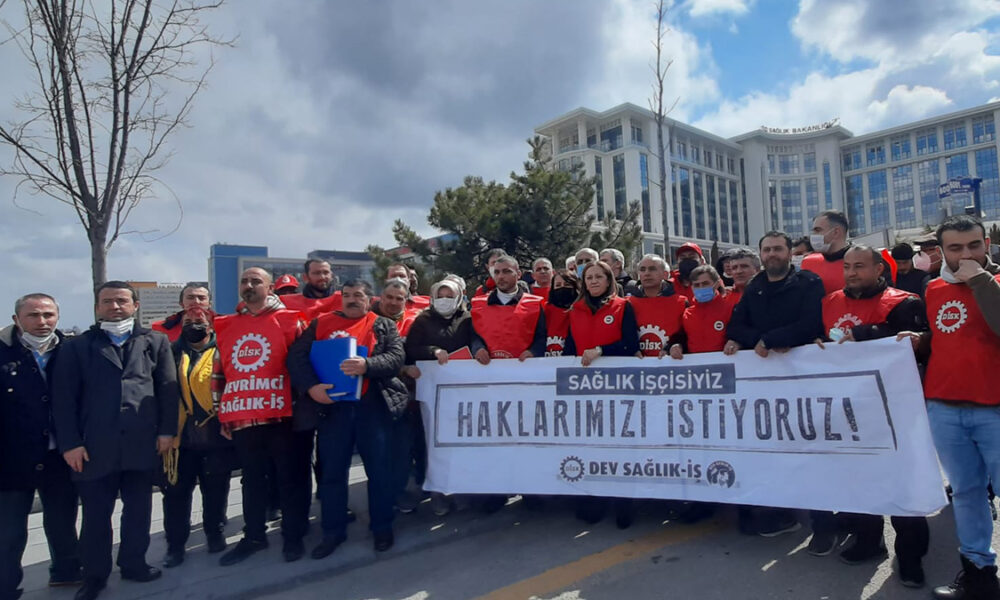 Devrimci Sağlık İşçileri Sendikası’nın (Dev Sağlık-İş) “Sağlık emekçisiyiz, haklarımızı istiyoruz!” kampanyası kapsamında sağlık işçileri, sağlık işçilerinin geçim sorununa, pandemiye uygun olmayan çalışma şartlarına, sağlıkta şiddetin yaygınlaşmasına dair talepleri için imza topladı. Farklı illerde ve hastanelerde imza toplayan sağlık işçileri, topladıkları imzaları Sağlık Bakanlığı’na getirdi. DİSK ve Dev Sağlık-İş Genel Başkanı Arzu Çerkezoğlu’nun da katılımıyla sağlık işçileri Sağlık Bakanlığı önünde basın açıklaması yaptı.