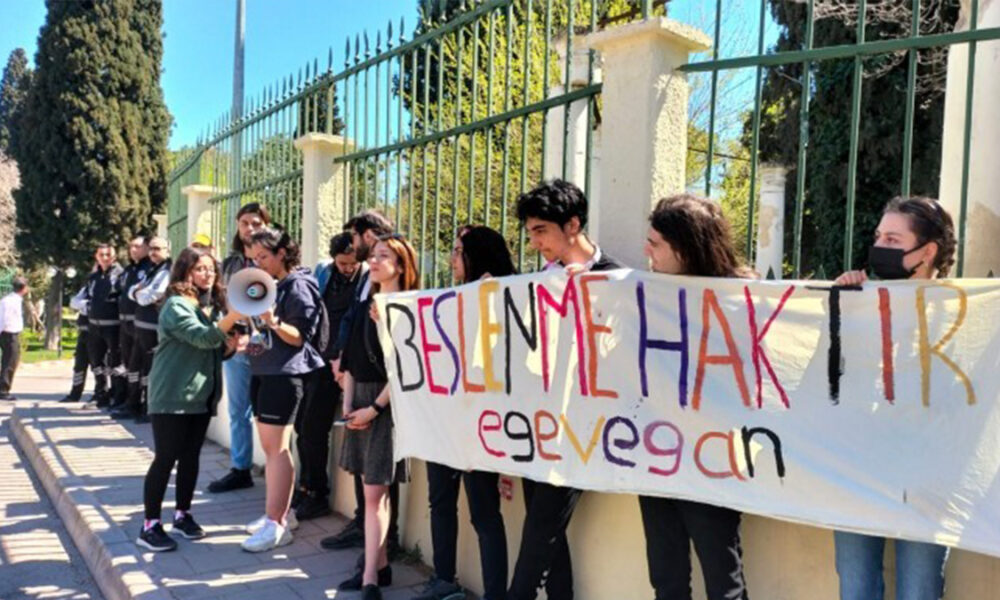 Ege Üniversitesi Vegan Topluluğu, okulun yemekhanelerinde vegan menü çıkmamasına yönelik Bornova’da bulunan Ege Üniversitesi Rektörlüğü önünde basın açıklaması yaptı. “Beslenmek haktır” pankartının açıldığı açıklamada sık sık “Vegan ol yaşamdan yana ol” sloganı atıldı.