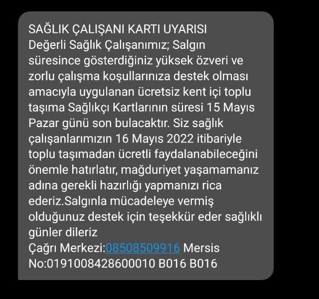 Sağlık emekçilerine ücretsiz basım hakkının kaldırıldığı ise mesajla bildirildi. Sağlık emekçilerine gönderilen mesajda; Salgın sürecinde gösterdiğiniz yüksek özveri ve zorlu çalışma koşullarınıza destek olması amacıyla uygulanan ücretsiz kent içi toplu taşıma Sağlıkçı Kartlarının süresi 15 Mayıs Mayıs Pazar günü son bulacaktır.” denildi.