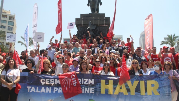 Ardından konuşan CHP Genel Başkan Yardımcısı Ali Öztunç da, “Tayyip Erdoğan almış eline cetveli kalemi haritayı çiziyor. ‘Şurası bu ülkenin iş adamına burası Katarlıya’ diye çiziyor. İzmir buna izin vermeyecek. Bunlar hazineyi soydular, 128 milyar doları buharlaştırdılar. Sıra Çeşme gibi turizm alanına geldi. Buna izin vermeyeceğiz. İstanbul’da kanal İstanbul, İzmir’de Çeşme projesi rant projesidir” ifadelerini kullandı.