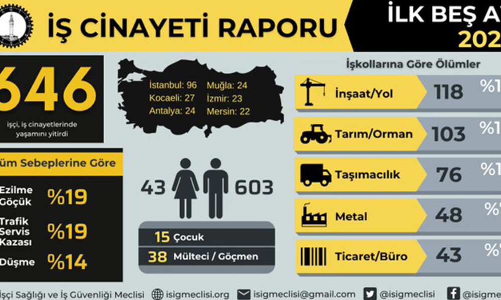İşçi Sağlığı ve İş Güvenliği (İSİG) Meclisi’nin yayımladığı iş cinayetleri raporuna göre 2022 yılının ilk beş ayında en az 646 işçi iş cinayetlerinde hayatını kaybetti. Raporda Mayıs ayı ile birlikte güvencesiz çalışmanın en yoğun olduğu inşaatlarda ve tarımdaki iş cinayetlerinde bir artışın meydana geldiği belirtildi.