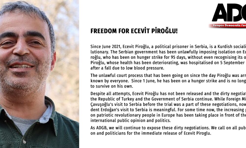 Avrupa Demokratik Güç Birliği birçok dilde paylaştığı açıklamasında, Sırbistan’da tutuklu bulunan ve Türkiye’ye iade edilmek istendiği için açlık grevine girip 95. günde hastaneye kaldırılan enternasyonalist devrimci Ecevit Piroğlu’na özgürlük istedi.