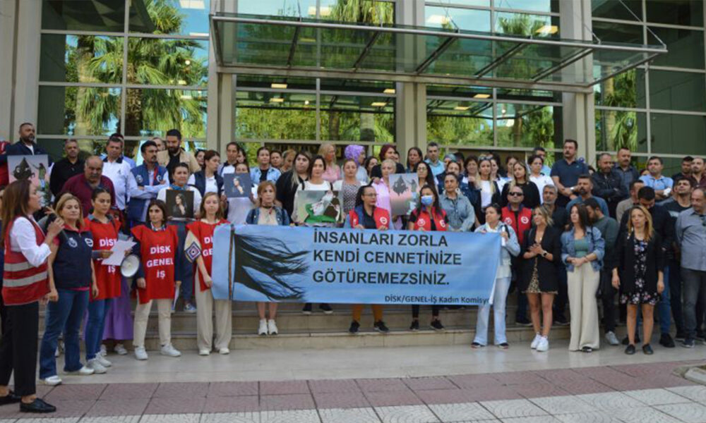 Devrimci İşçi Sendikaları Konfederasyonu’na (DİSK) bağlı Genel İş Sendikası Kadın Komisyonu öncülüğünde İzmir Büyükşehir Belediyesi çalışanları Kültürpark 1 Nolu Hol’ün önünde bir araya gelerek Jîna Mahsa Amînî’nin katledilmesini ve molla rejimini protesto etti. “İnsanları zorla kendi cennetinize götüremezsiniz” yazılı pankartın taşındığı alanda kadınlar, “Yasta değil isyandayız”, “Jin jiyan azadî” ve “Sessiz kalma, suça ortak olma” sloganlarını attı. Açıklamayı, Komisyon adına Aslıhan Yılmaz okudu.