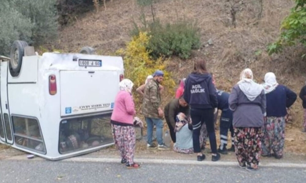 Aydın’ın Köşk ilçesinde zeytin hasadında çalışan tarım işçilerinin bulunduğu Muammer Serinkan yönetimindeki minibüs, Koçak Mahallesi Başdeğirmen mevkisinde sürücüsünün direksiyon hakimiyetini kaybetmesi sonucu devrildi.