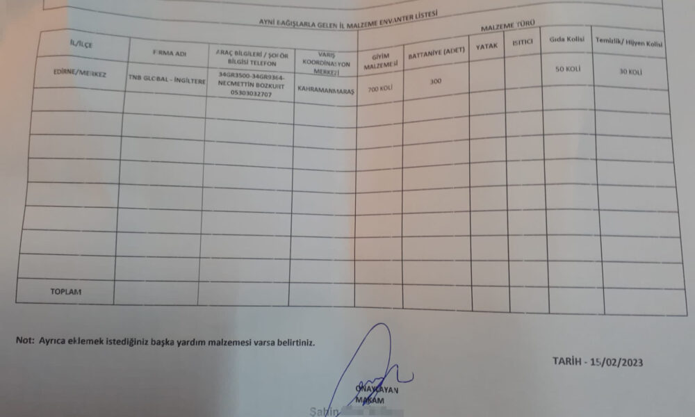 Londra’dan Kapıkule sınır kapısına kadar gelen yardım tırları sınırda AFAD yetkililerince durduruldu. Bölgeye yardımların yasal olarak sadece AFAD tarafından yapılabileceğini söyleyen yetkililer, gelen tırların AFAD’a teslimi yapılmadığı taktirde bağlanacağını ve gönderen hakkında yasal işlem yapılacağını söyledi.