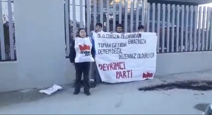İstanbul Çevre ve Şehircilik Müdürlüğü önünde “Ölülerimizin mezarından enkazınıza toprak getirdik, Deprem değil düzeniniz öldürüyor!” pankartıyla zincirli eylem yapan Devrimci Parti üyeleri deprem bölgelerinden getirdikleri toprağı Çevre ve Şehircilik Müdürlüğü binasının önüne döktü.