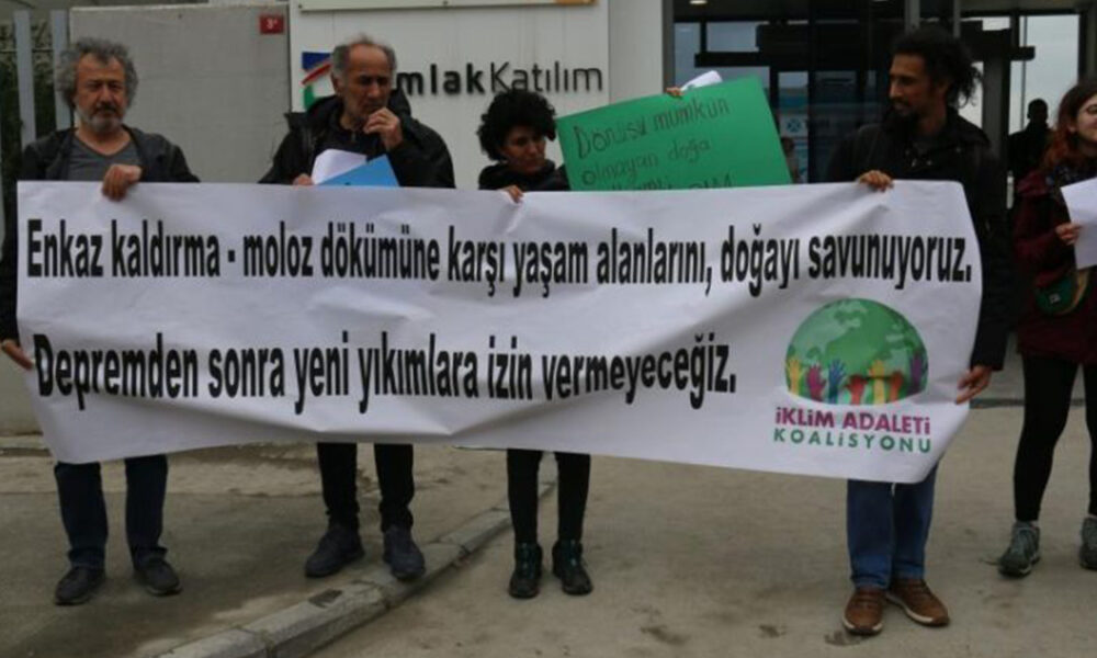 İklim Adaleti Koalisyonu, depremzedelerin yaşam alanlarına ve tarım alanlarına dökülen enkaz molozlarına karşı İstanbul’da açıklama yaptı