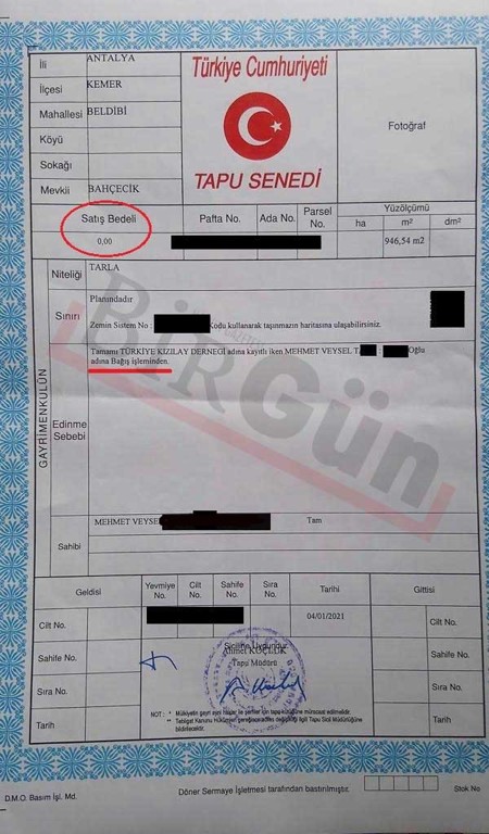 Deprem felaketinin ardından çadır satarak skandala imza atan Kızılay, peş peşe patlak veren yolsuzluk iddiaları ile gündemden düşmüyor. Şimdi de sel ve deprem gibi her felaketin ardından bağış isteyen Kızılay’ın, değeri milyonlarca lira olan turizm bölgesindeki arazisini bir şahsa bağışladığı ortaya çıktı. BirGün’ün ulaştığı belgelere göre, Kızılay Antalya Kemer’deki bir arazisini 4 Ocak 2021 tarihinde Mehmet Veysel T. isimli bir şahsa bağışladı. Söz konusu işlem tapu kayıtlarına “Tamamı Türkiye Kızılay Derneği adına kayıtlı olan arsa Mehmet Veysel T.’ye bağışlandı” ifadeleriyle işlendi. 946 metrekare büyüklüğündeki arazinin satış bedelinin “sıfır TL” olduğu belirtildi.