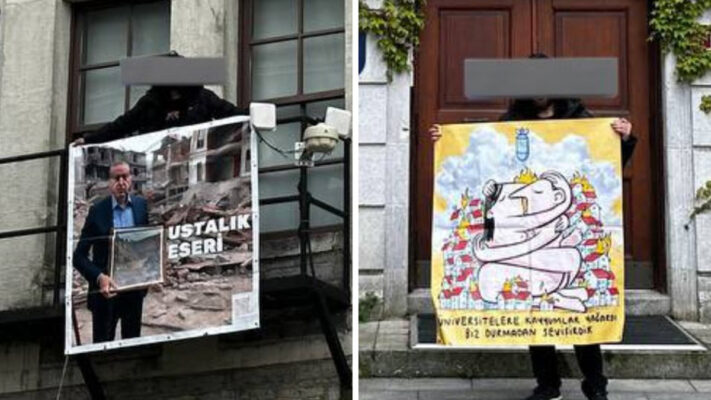 Boğaziçi Üniversitesinde kampüs içinde iktidarın politikalarını eleştiren çizimlerle fotoğraf çekilen öğrenciler gözaltına alındı.