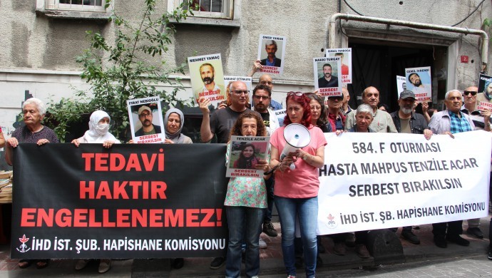 İnsan Hakları Derneği (İHD) İstanbul Şubesi Hapishaneler Komisyonu, hasta tutukluların durumuna dikkat çekmek amacıyla her hafta düzenledikleri “F Oturumu” eyleminin 584’üncüsünü dernek binası önünde gerçekleştirdi. Bu haftaki eylemde, Bakırköy Kadın Kapalı hapishanesi’nde tutuklu bulunan hasta tutuklu Tenzile Acar’ın sağlık durumuna dikkat çekildi. “Hasta mahpus Tenzile Acar serbest bırakılsın” pankartı açılan eylemde sık sık, “Tedavi haktır engellenemez” ve “Hasta mahpuslar serbest bırakılsın” sloganları atıldı. Açıklamaya çok sayıda hasta tutuklu yakını ile insan hakları savunucu katıldı.