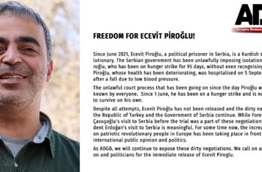 Avrupa Demokratik Güç Birliği birçok dilde paylaştığı açıklamasında, Sırbistan’da tutuklu bulunan ve Türkiye’ye iade edilmek istendiği için açlık grevine girip 95. günde hastaneye kaldırılan enternasyonalist devrimci Ecevit Piroğlu’na özgürlük istedi. ADGB’nin açıklamasının tamamı şu şekilde: Ecevit Piroğlu’na özgürlük! 2021 Haziran ayından beri Sırbistan’da tutsak edilen siyasi Ecevit Piroğlu, sosyalist Kürt [Devamını Oku…]