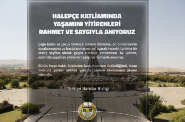 Halepçe Katliamı’nın yıldönümüne ilişkin açıklama yapan Türkiye Barolar Birliği (TBB), yaşamını yitirenleri saygıyla andıklarını belirtti. Halepçe Katliamı’nın 34’üncü yıl dönümüne ilişkin açıklama yapan Türkiye Barolar Birliği, “Halepçe katliamında yaşamını yitirenleri rahmet ve saygıyla anıyoruz” dedi.TBB’nin yaptığı açıklamada şunlar belirtildi: “Çoğu kadın ve çocuk binlerce insanın ölümüne, on binlercesinin yaralanmasına ve [Devamını Oku…]