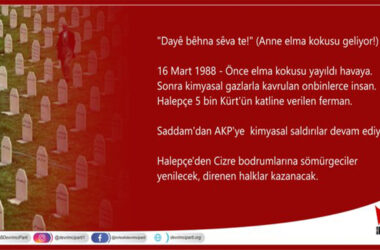 Devrimci Parti yaptığı açıklama ile “Halepçe’den Cizre bodrumlarına sömürgeciler yenilecek, direnen halklar kazanacak” dedi. Birleşik Devrimci Parti (Devrimci Parti), Halepçe Katliamının 34. yılında açıklama yayımladı. Açıklamada; “Dayê bêhna sêva te – Anne elma kokusu geliyor. Önce elma kokusu yayıldı havaya. Sonra kimyasal gazlarla kavrulan on binlerce insan. Halepçe 5 bin [Devamını Oku…]