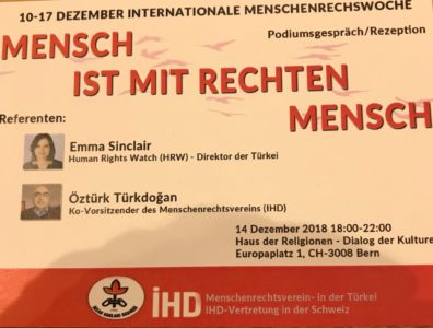 Türkiye’de insan hakları mücadelesinde tarihi bir yeri olan İnsan hakları Derneği “10-17 Aralık Uluslararasi İnsan hakları haftasında” 14 Aralık 2018 tarihinde İsviçre’nin Bern kentinde, Haus der Religionen kurumunda bir resepsiyon ve panel ile kuruluşunu duyurdu. “İnsan, haklarıyla insandır” teması ile gerçekleşecek olan panel, Human Rights Watch Türkiye Direktörü Emma Sinclair ve İnsan Hakları [Devamını Oku…]