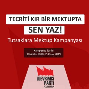 Devrimci Parti Avrupa Devrimci tutsaklar için ” Her Mektup, Bir Umut’tur. Dostluk, Arkadaşlık, Yoldaşlıktır Dayanışmadır Tecrite Bir Darbedir” diyerek mektup kampanyası başlattı. Devrimci Partinin açıklaması ise şu şekilde; Yurtdışında bulunan dostlarımızın başlattığı “Tecriti kır bir mektupta sen yaz” kampanyasını destekliyor, Hapishanelerde süren açlık grevlerine ve tecrite karşı duyarlılık çağrısı yapıyoruz.Kampanyanın basın [Devamını Oku…]