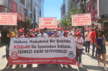“Hırsız değil emekçiyiz” şiarıyla Karşıyaka çarşıda yürüyen Kent A.Ş. direnişçileri, kod 46’ya gerekçe sunulan iddiaların ispatlanmasını istedi. Direnen işçiler, “Bu onur kırıcı karardan dönün” diyerek patronları uyardı. İzmir Karşıyaka Belediyesi Kent A.Ş. işçilerinin direnişi sürüyor. 9 Ağustos’ta 93 işçi patronun güvenini kötüye kullanma, hırsızlık, meslek sırlarını ortaya atması gibi eylemleri [Devamını Oku…]