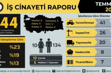İSİG Meclisi’nin Temmuz ayı raporuna göre, 144 iş cinayeti yaşandı. İşçi Sağlığı ve İş Güvenliği (İSİG) Meclisi, Temmuz ayı iş cinayetleri raporunu açıkladı. İSİG raporuna göre, Temmuz ayında 144 işçi iş cinayetinde yaşamını yitirdi. Ölüm sebeplerinin belirtildiği raporda, yüzde 23 trafik kazası, yüzde 19 ezilme ya da göçük, yüzde 13 [Devamını Oku…]