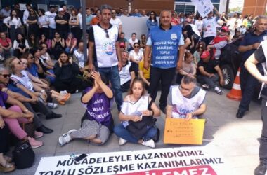 Bayraklı Belediyesi çalışanları, maaşlarından sosyal haklarına yönelik kesinti yapılmasına karşı başlattıkları oturma eylemi devam ediyor. İzmir Bayraklı Belediyesi’nde çalışanlarının maaşlarından sosyal haklarına yönelik kesinti yapılmasına tepkiler devam ediyor. Kesintinin iadesi talebiyle 14 Mayıs’ta belediye binası önünde eylem başlatan çalışanlar, hafta içi her gün oturma eylemi yapıyor. Çalışanlar, “Mücadeleyle kazandığımız toplu [Devamını Oku…]