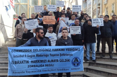 İstanbul İl Sağlık Müdürlüğü’nde çalışan taşeron araç şoförleri, yaşadıkları sorunlara ilişkin müdürlük önünde basın açıklaması düzenledi ve taleplerini sıraladı. İstanbul İl Sağlık Müdürlüğü’nde çalışan taşeron araç şoförleri, KATAŞ-SEN öncülüğünde Fatih’te bulunan müdürlük binası önünde basın açıklaması düzenledi. “Görmezden geldiğiniz, hakkını yediğiniz İstanbul İl Sağlık Müdürlüğü taşeron şoförleriyiz. İş bıraktık, hakkımızı [Devamını Oku…]
