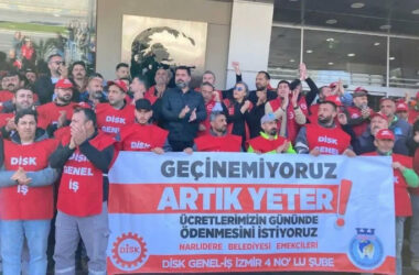 Narlıdere Belediyesi işçileri, toplu iş sözleşmesinde belediye yönetiminin verdiği yüzde 44’lük teklifi reddetti ve gerv kararı aldı. İşçiler, okul, huzurevi, hastane dışında çöp toplamayacak. Narlıdere Belediyesi işçileri, toplu iş sözleşmesinde belediye yönetiminin verdiği yüzde 44’lük teklifi redderek grev kararı aldı. Genel İş sendikasında örgütlü işçiler, belediye binasına grev pankartı astı. [Devamını Oku…]