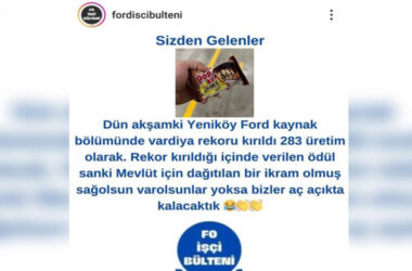 Koç Holdinge ait Ford Otosan’ın Yeniköy fabrikasında tek vardiyada üretim rekoru kıran işçiler pop kekle ödüllendirildi Ford Otosan’ın Yeniköy fabrikasında tek vardiyada üretim rekoru kıran işçiler pop kekle “ödüllendirildi.” Duruma tepki gösteren işçiler, “Hâlâ bizi kekle tatlıyla kandırmaya çalışıyorlar” dedi. 150 bini aşkın işçiyi ilgilendiren MESS grup toplu sözleşmesi, 17 [Devamını Oku…]