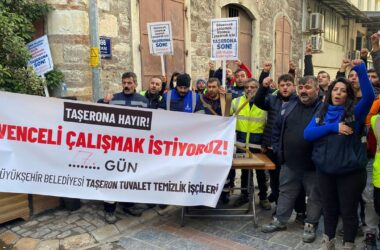İzmir Büyükşehir Belediyesi’ne ait tuvalet ve bebek bakım merkezlerinin temizliğini yapan taşeron işçileri, güvenceli iş talebiyle çıktıkları grevin 7’nci gününde direnişi sürdürüyor. Eseray Temizlik Şirketi’ne bağlı taşeron işçiler, dün akşam saatlerinde işten çıkarıldı. 4 yıldır temizlik görevlisi olarak çalışan Doğukan Bayar, “Yıllardır kölelik koşullarında çalışıyoruz. Artık dayanamadığımız için haklı talebimizi [Devamını Oku…]