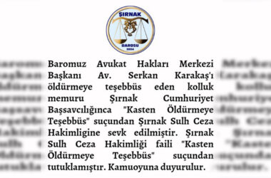 Şırnak Barosu, avukat Serkan Karakaş’a otomobiliyle kasten çarpan polis tutuklandığını duyurdu. Şırnak Barosu, avukat Serkan Karakaş’a otomobiliyle kasten çarptığı iddia edilen komiserin tutuklandığını duyurdu. Şırnak Emniyet Müdürlüğü’nde görev yapan bir komiserin, Avukat Hakları Merkezi Başkanı Serkan Karakaş’a otomobiliyle kasten çarparak yaraladığı iddia edilmişti. Şırnak Barosu, komiserin tutuklandığını duyurdu. Şırnak Barosu [Devamını Oku…]