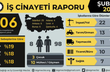 İşçi Sağlığı İş Güvenliği Meclisi (İSİG) raporuna göre Şubat ayında en az 106 işçi, iş cinayetinde hayatını kaybetti. İSİG Meclisi açıklamasında, “Yüzde 63’ünü ulusal basından; yüzde 37’sini ise yerel basın, işçilerin mesai arkadaşları, aileleri, iş güvenliği uzmanları, işyeri hekimleri, meslek örgütleri ve sendikalardan öğrendiğimiz bilgilere dayanarak tespit ettiğimiz kadarıyla Şubat ayında en az [Devamını Oku…]