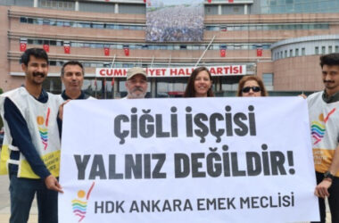 HDK Ankara Emek Meclisi, işten atıldıkları için 54 gündür CHP genel merkezi önünde direnişte olan Çiğli Belediyesi işçilerini ziyaret etti. Halkların Demokratik Kongresi (HDK) Ankara Emek Meclisi, CHP genel merkezi önünde işe iade talebiyle 54 gündür direnişte olan İzmir Çiğli Belediyesi işçilerine dayanışma ziyaretinde bulundu. İşten çıkarılan işçilerinden Hale Ören [Devamını Oku…]