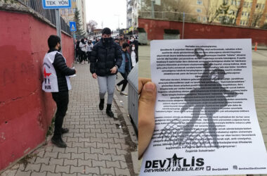 Ankara Mamak ilçesinde bulunan Ege Lisesi önünde “demokratik, bilimsel ve parasız eğitim için mücadeleye” içerikli bildiri dağıtan iki Dev-Lis üyesi okulun önüne gelen polislerce zor kullanılarak gözaltına alındı. Bugün öğlen saatlerinde gerçekleşen polis müdahalesiyle Enes Uğur Tekin ve 18’yaşından küçük olan T.A.nın gözaltına alındığı öğrenildi.