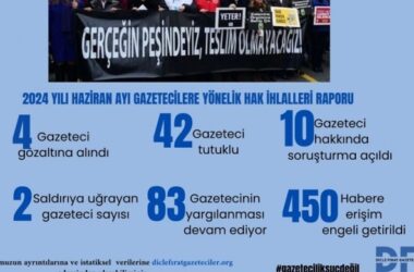 Tutuklu gazeteci sayısının 42 olduğunu belirten DFG, Mayıs ayı raporunda 9’uncu yargı paketinde yer alan “Etki ajanlığı” maddesiyle gazeteciliğin kıskaca alınmaya çalışıldığını ve çekilmesi gerektiğini vurguladı. Dicle Fırat Gazeteciler Derneği, 2024 Yılı Mayıs Ayı Gazetecilere Yönelik Hak İhlalleri Raporu’nu açıkladı. Raporda gazetecilerin ev baskınlarıyla gözaltına alınması, kötü muameleye maruz kalması [Devamını Oku…]