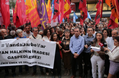 Van halkının iradesinin gasp edilmesine karşı İzmir’de yapılan eyleme katıldıkları gerekçesiyle evleri basılarak gözaltına alınan 16 kişi adliyeye sevk edildi. Çıplak arama işkencesine maruz kalan devrimciler adliyeye çıkarılırken polis tarafından darp edildi. 31 Mart yerel seçimlerinin ardından Van halkının iradesinin gasp edilmesine karşı İzmir’de yapılan eyleme katıldıkları gerekçesiyle 15 Mayıs [Devamını Oku…]